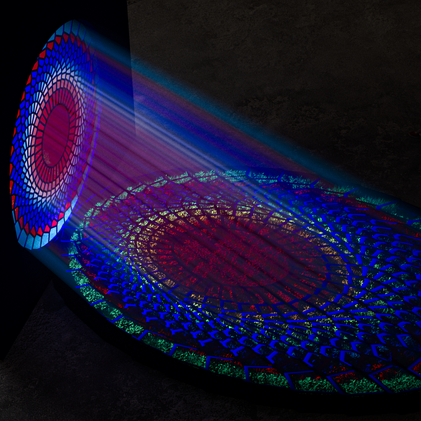 Instaliacija reflektuoja laisvo žaidimo džiaugsmą, betikslį tyrinėjimą ir momento laikinumą. Šis laikinumas yra iliustruojamas šviesos spindulių, sujungiančių vitražą ir sekretą.
